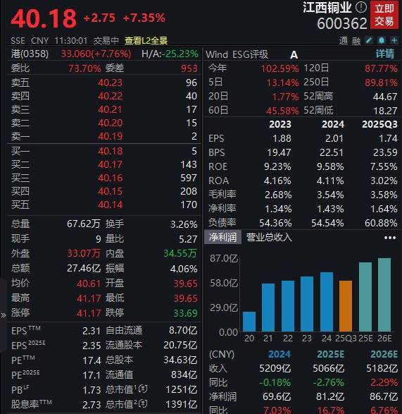 【大河财立方消息】12月1日国客信配国客信配,江西铜业股价高开高走国客信配,盘中一度涨停。截至上午收盘,江西铜业股价上涨7.35%,市值1251亿元。